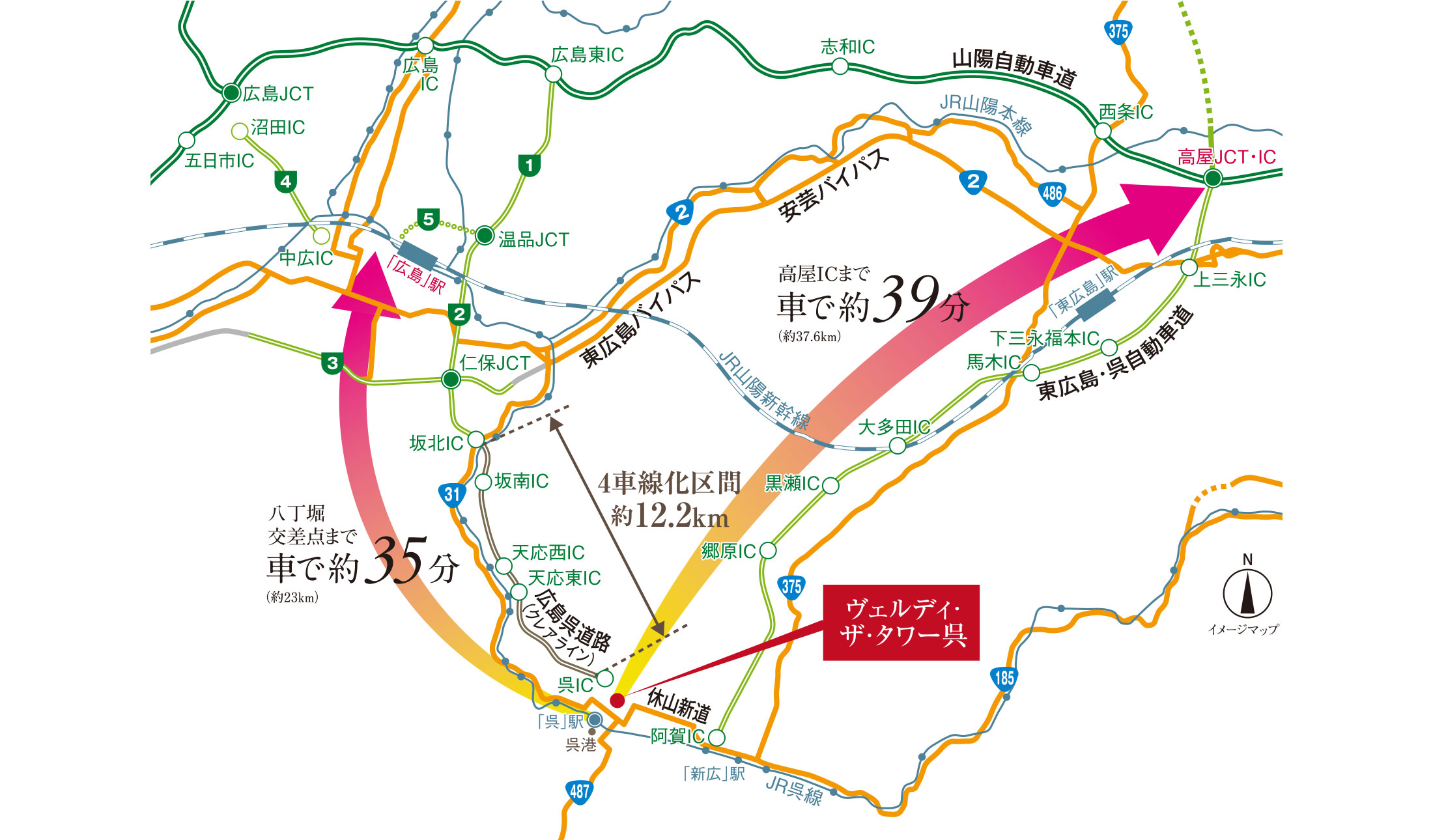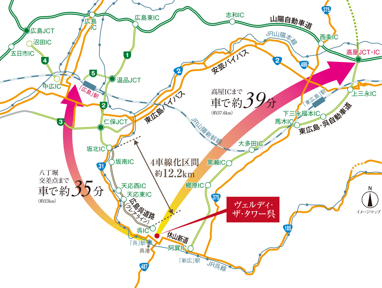 徒歩11分のJR「呉」駅をはじめ、市内や広域を網羅するバス路線、呉港発着の定期航路などの公共交通機関の充実により、さまざまなエリアと直結。交通利便性の高さを実感できます。マイカーを利用すれば、広島呉道路(クレアライン)の呉ICへはわずか3分。東広島・呉自動車道の整備の完了に続き、広島呉道路の4車線化工事もはじまり、高速道路ネットワークはこれからさらに進化。日々の生活圏も、休日ドライブや家族でのレジャーの楽しみも広がっていきます。