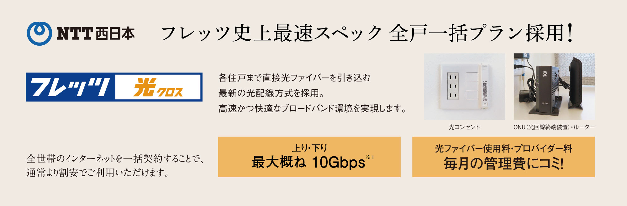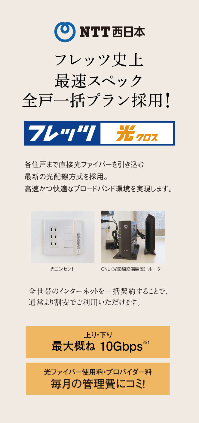 ※1:通信技術規格における最大値に基づくイメージです。詳しくは係員にお尋ねください。※技術規格上の最大値であり実効速度ではありません。なお、最大概ね10Gbpsでは通信品質確保などに必要なデータが付与されるため、実効速度の最大値は技術規格上の最大値より十数%程度低下します。インターネットご利用時の速度は、端末機器の仕様などお客さまのご利用環境や回線の混雑状況などによって低下します。※インターネットの使用料は毎月の管理費に含まれます。ご利用の有無に関わらず料金が発生します。※各部屋まで空配管を用意していますので、LANケーブルを配線することで有線接続することができます。※LANケーブル工事については、お客様にてご手配ください。(工事費用はお客様負担となります。)