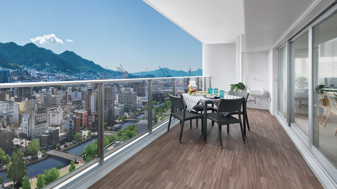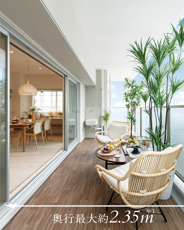 ゆとりある広さに気持ちのいい開放感を与えてくれるだけでなく、採光性が高まり視界も大きく広がります。合わせガラスの手摺は安全性が高く、気になる紫外線もカット。ガーデンファニチャーを置いて、カフェテラス感覚のおしゃれな生活も演出できます。