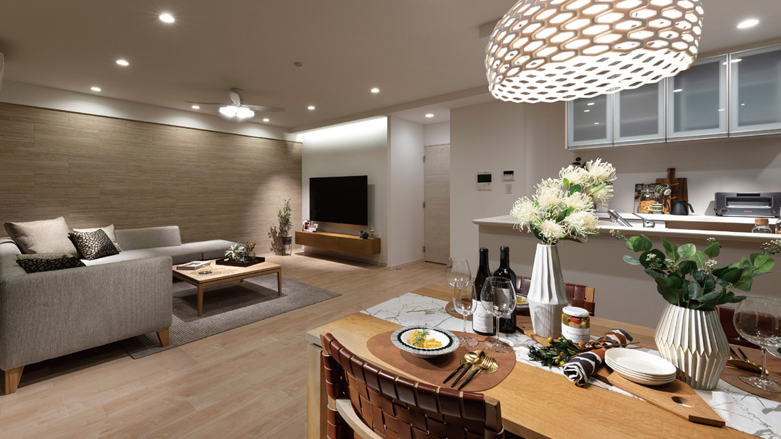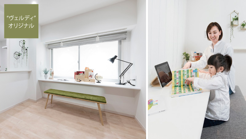 独自のファミリーカウンター。リビング・ダイニングに設けたファミリーカウンターは、生活スタイルや家族構成にあわせて自由に、便利に利用できます。パソコンデスクをはじめ、ワークテーブルやインテリアカウンターになるほか、お子さまのリビング学習にもぴったり。保護者さまのそばで勉強するリビング学習は、学習効果が高まるといううれしいデータもあります。