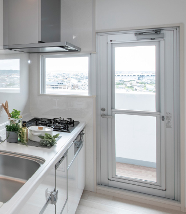 キッチンからバルコニーへの動線が生まれ、生ゴミ等の一時保管も可能に。換気にも便利に使え、ガラスドアは採光性を高めてくれます。